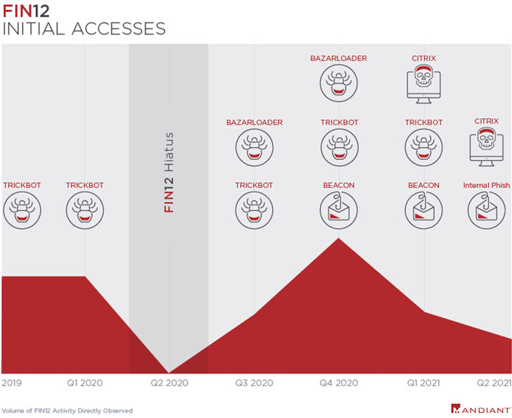 Cybersecurity firm Mandiant attributed the intrusions to a Russian-speaking hacker group codenamed FIN12, and previously tracked as UNC1878, with a disproportionate focus on healthcare organizations with more than $300 million in revenue, among others, including education, financial, manufacturing, and technology sectors, located in North America, Europe, and the Asia Pacific.