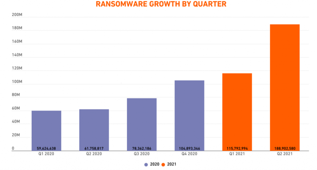 The level of attacks appears to be increasing, according to SonicWall. Ransomware volume jumped from 115.8 million attacks in Q1 to 188.9 million attacks in Q2.