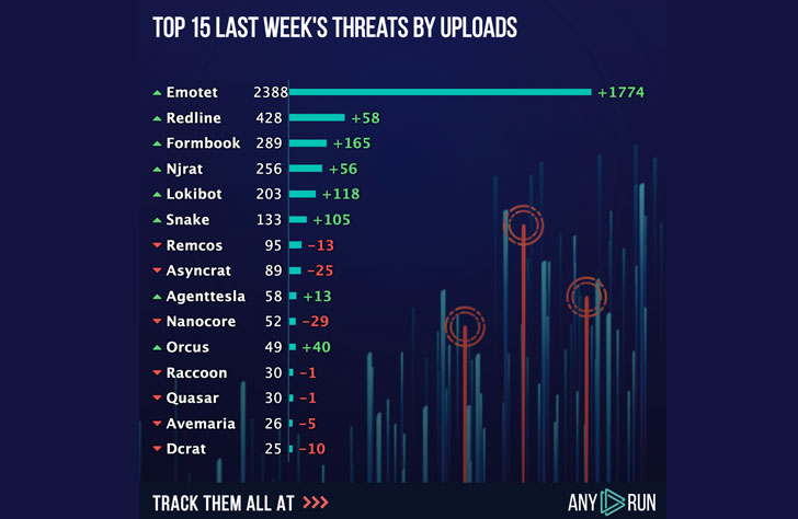 In 2021 after the comeback, Emotet led the top 3 of uploads in ANY.RUN sandbox. Even after such a long break, it still got popular. All statistics on Emotet trends are available in Malware Trends Tracker, and the numbers are based on the public submissions.