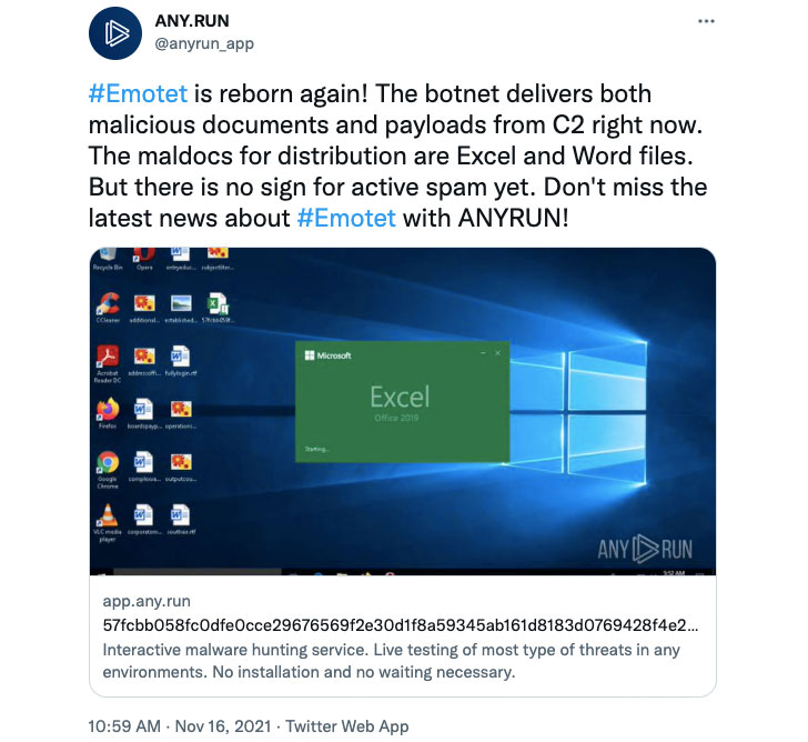 November 2021, it was reported that TrickBot no longer works alone and delivers Emotet. And ANY.RUN with colleagues in the industry were among the first to notice the emergence of Emotet’s malicious documents.