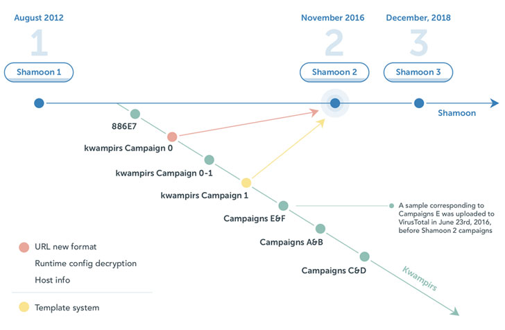 In connecting the disparate dots, the investigation has led to the assessment that Kwampirs is likely based on Shamoon 1 and that Shamoon 2 inherited some of its code from Kwampirs, implying that the operators of both the malware are different sub-groups of a larger umbrella groups or that it’s the work of a single actor.