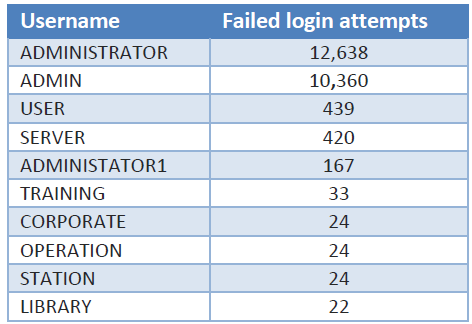 Among the 35,000 brute-force login attempts made every five minutes, these were the most common usernames the attackers tried to use. Source: Sophos