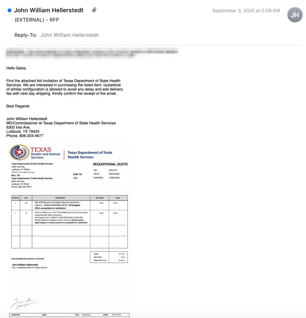 In the attack email, the scammers informed the recipient organization’s sales department that they were interested in purchasing 20 laptops and 200 external hard drives on behalf of the Texas Department of State Health Services.