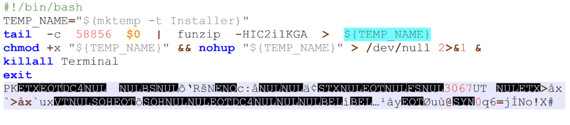 funzip is a macOS utility that extracts a ZIP or gzip file directly to output from archives or other piped input. The malicious binaries use funzip to extract the malicious binary with a password and using head or tail commands in the format as shown below: