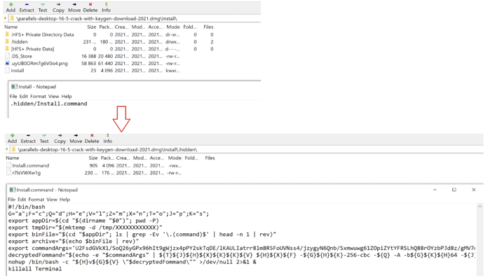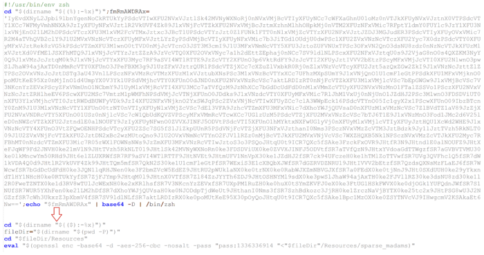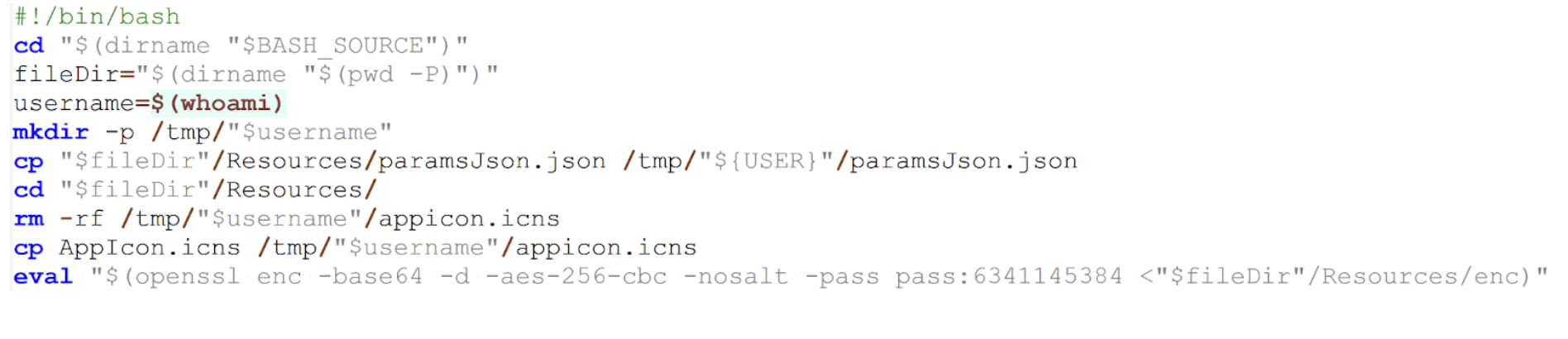 The openssl program is a command line tool in macOS for using the various cryptography functions (SSL, TLS) of OpenSSL’s crypto library from the shell. We have observed malicious binaries use openssl with base64, Advanced Encryption Standard (AES), CBC (Cipher Block Chaining) to thwart security scanners in the format as shown below:
