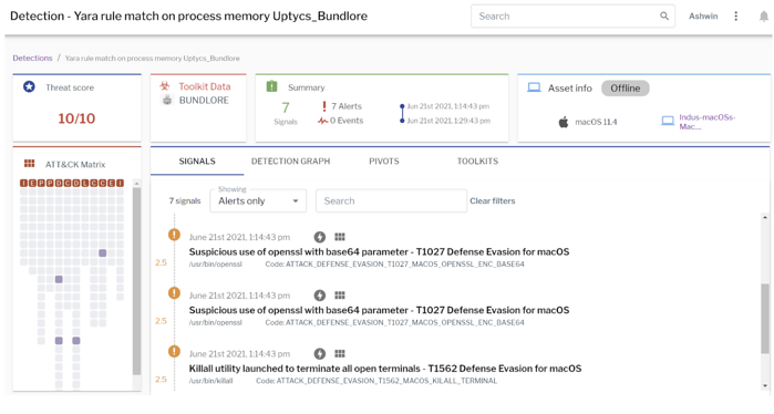 Uptycs’ EDR capabilities powered with yara scanning detected Bundlore activity with a threat score of 10/10 as shown in the figure below.