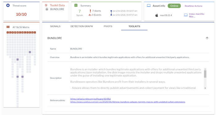 Additionally, Uptycs EDR contextual detection provides additional details about the detected malware. Users can navigate to the toolkit data section in the detection alert and click on the name to find out the behavior and working of Bundlore as shown in the figure below.