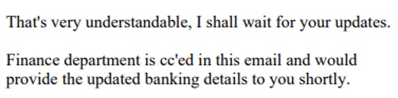 What happened next was that the attackers tried to divert the victim’s customer’s payments to accounts they controlled. In their hunt for legitimacy, they went so far as to copy more email addresses, to make it look like they were requesting support from an internal department. But these additional email addresses were just as bogus, being sent with the same almost, not-quite, look-alike typosquat domain.