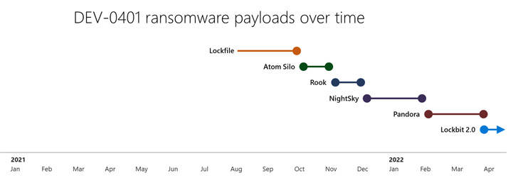 Since August 2021, the group is said to have cycled through as many as six different ransomware strains such as LockFile (August), Atom Silo (October), Rook (November), Night Sky (December), Pandora (February 2022), and most recently LockBit 2.0 (April).