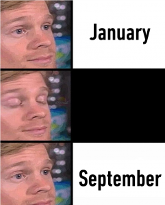 “The low-quality image shows three frames of the ‘white guy blinking’ meme alongside the words January, a black screen, and September,” Hahn added. “The image content itself does not seem to make sense.”