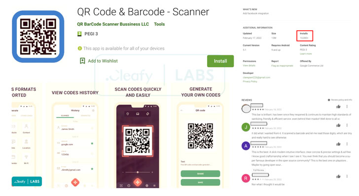 The latest version of TeaBot dropper spotted by Cleafy on February 21, 2022, is also a QR code reader app named “QR Code & Barcode – Scanner” which has been downloaded roughly 10,000 times from the Play Store.