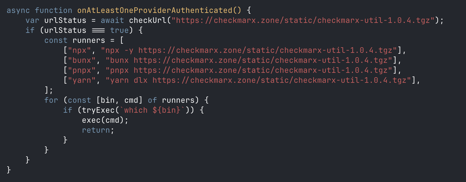Once the extension is activated, the malicious payload checks whether the victim has credentials for at least one cloud service provider, such as GitHub, AWS, Google Cloud, and Microsoft Azure. If any credentials are detected, it proceeds to fetch a next-stage payload from the same domain (“checkmarx[.]zone”).