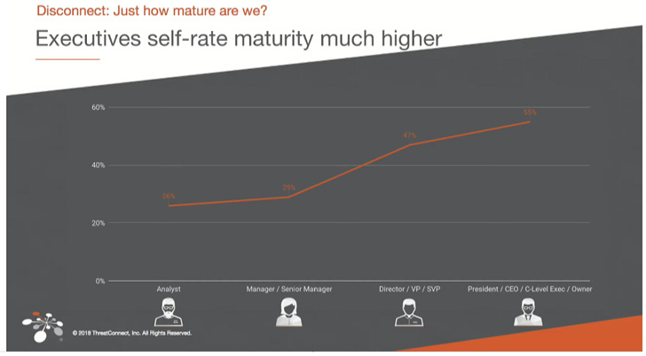 The above graph is from an excellent talk called “How to Get Promoted: Developing Metrics to Show How Threat Intel Works – SANS CTI Summit 2019”. It illustrates the disconnect between the high-level executives and “on-the-ground” employees and how high-level executives think that their defensive teams are much more mature than their team self-assessment.