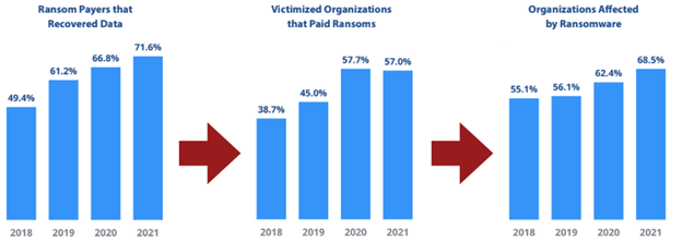 Currently, ransomware is the most prominent cyber threat to businesses and individuals. Ransomware attacks are growing more prevalent as cybercriminals find new ways to profit from them. According to CyberEdge’s 2021 Cyberthreat Defense Report, 62% of organizations were victimized by ransomware in 2019—up from 56% in 2018 and 55% in 2017. This rise is arguably fueled by the dramatic increase in ransomware payments. More than half (58%) of ransomware victims paid a ransom last year, which is up from 45% in 2018 and 39% in 2017.