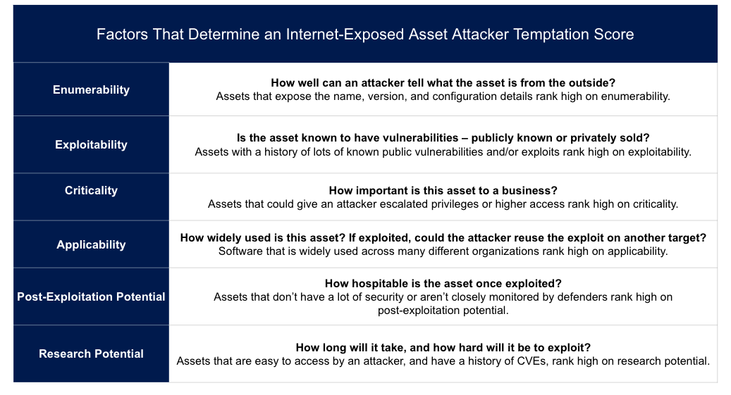 There’s a bit of an equation that goes into deciding what the most tempting targets are on an attack surface. While there isn’t an exact list of attributes an adversary uses to determine what to exploit, the logic above is pretty universal among attackers.