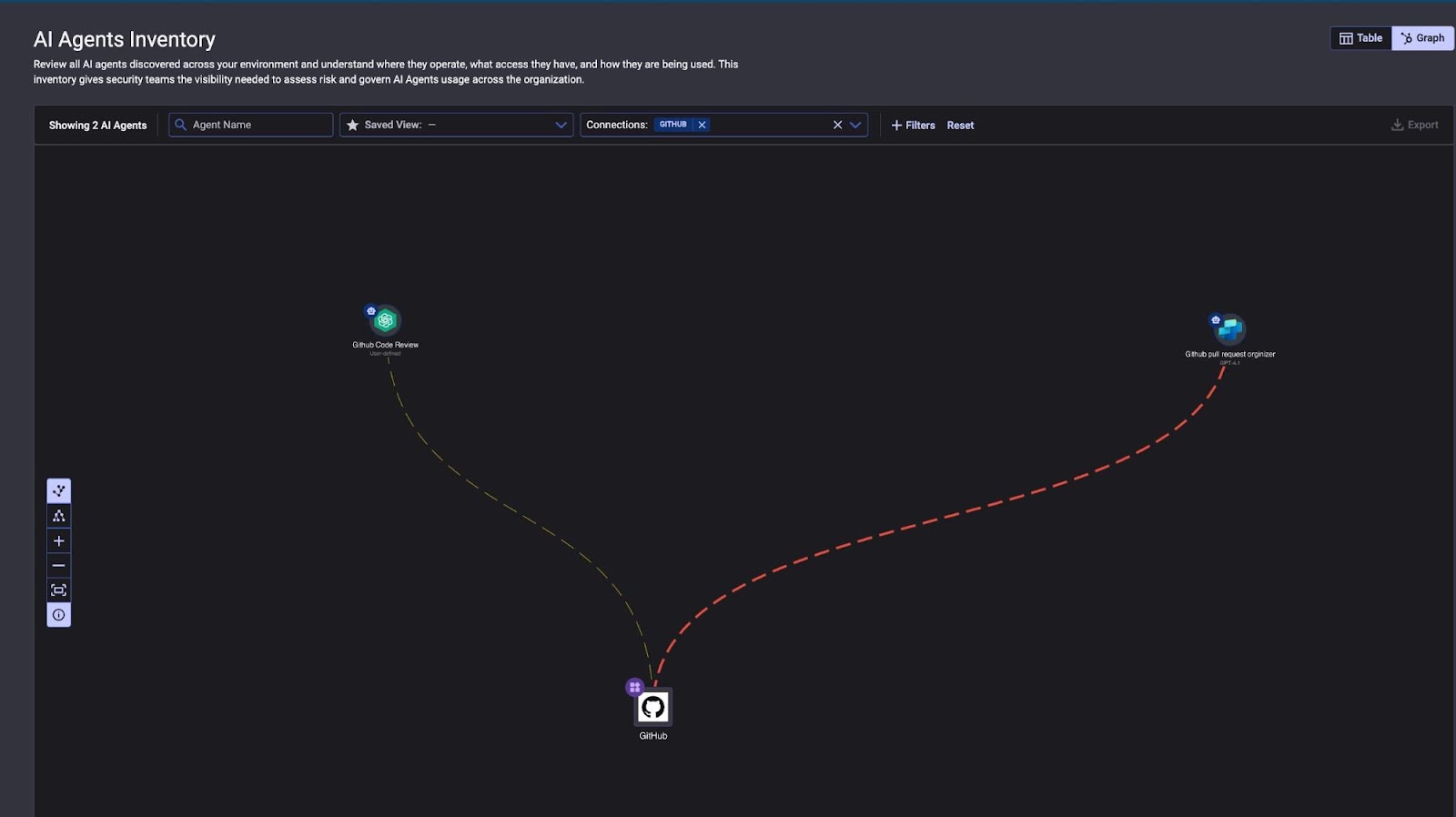 | Figure 1: Reco’s AI Agents Inventory, showing discovered agents and their connections to GitHub. |