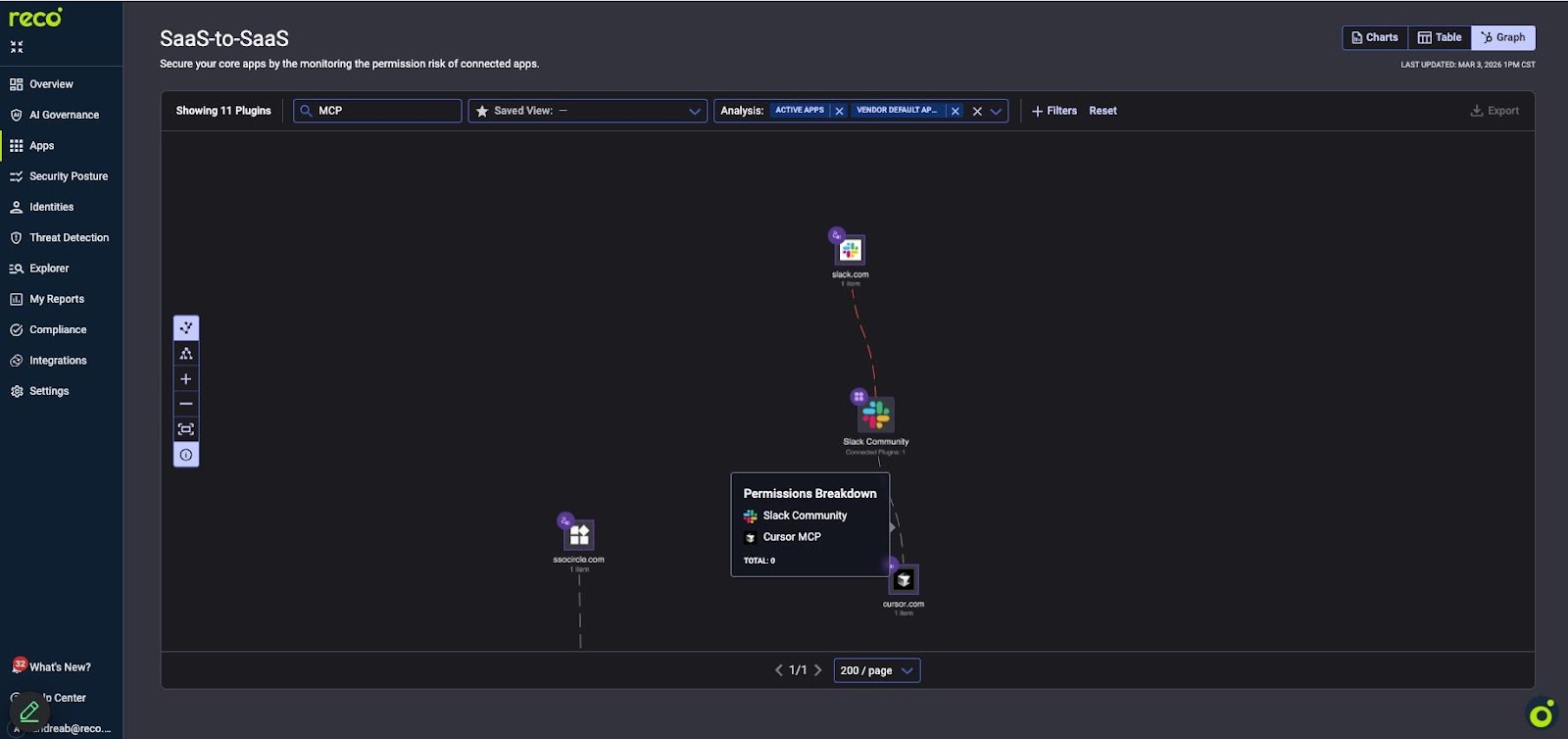 For each agent, Reco maps which SaaS apps it connects to, what permissions it holds, and what data it can access. Reco’s SaaS-to-SaaS visualization shows exactly how agents integrate across your application ecosystem, surfacing toxic combinations where AI agents bridge systems together through MCP, OAuth, or API integrations, creating permission breakdowns that no single application owner would authorize.