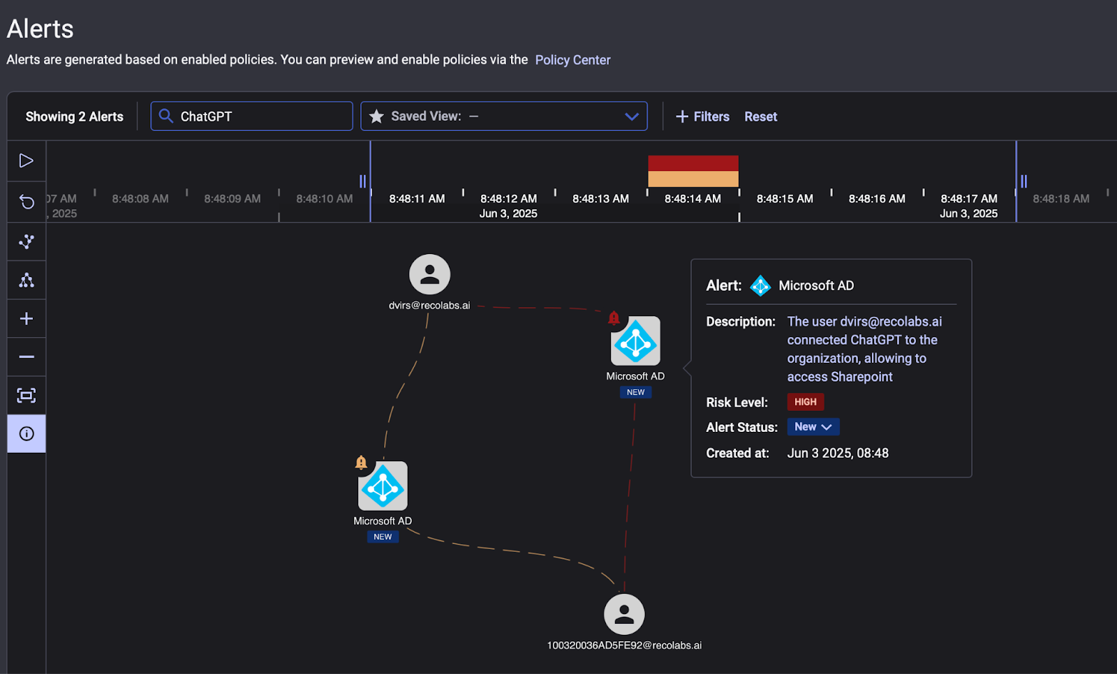 | Figure 4: A Reco alert flagging an unsanctioned ChatGPT connection to SharePoint. |