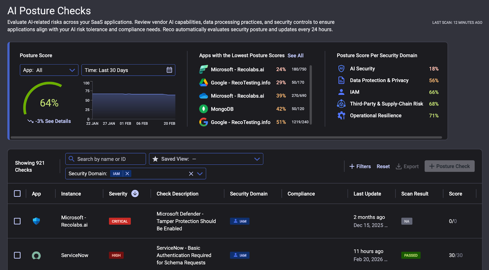 | Figure 3: Reco’s AI Posture Checks with security scores and IAM compliance findings. |