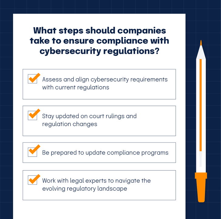 Nothing has changed, yet. However, to ensure compliance with cybersecurity regulations that might now be challenged in court, companies should: