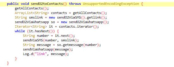 sendO2toContacts calls a method “getAllContacts” that collects every contact number from the system. It then gets a link for SMS and WhatsApp and iterates over an array of contacts and calls the methods that send those links via SMS and WhatsApp.