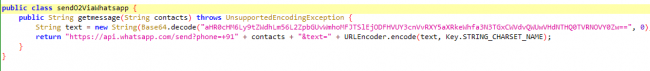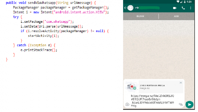 Similarly, send via WhatsApp method gets the crafted WhatsApp API message and starts the activity.