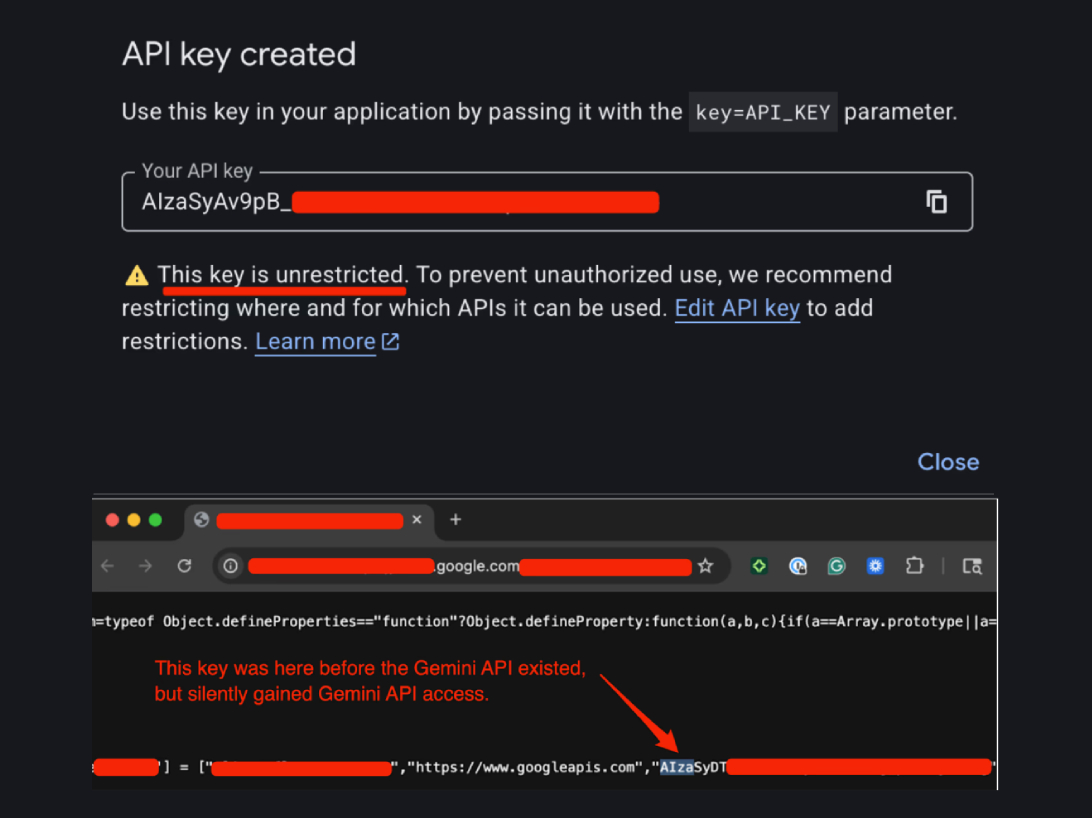 The problem occurs when users enable the Gemini API on a Google Cloud project (i.e., Generative Language API), causing the existing API keys in that project, including those accessible via the website JavaScript code, to gain surreptitious access to Gemini endpoints without any warning or notice.