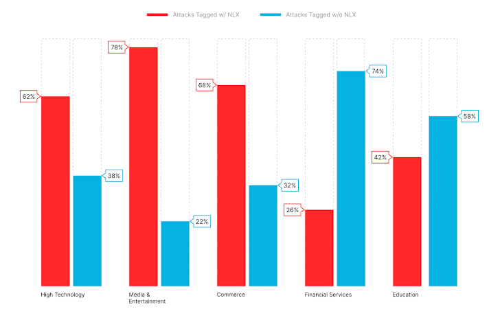 Although the Financial Services and Education industries recorded fewer attacks tagged with NLX, NLX still accounts for a considerable portion of each industry’s overall attack volume.