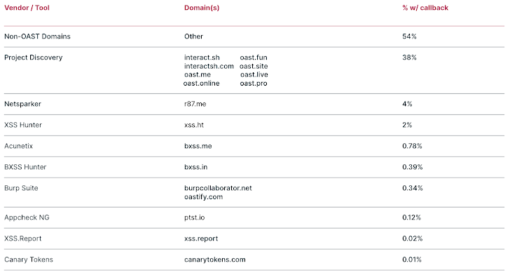 OOB callback domains are prevalent in attack payloads tagged with NLX. During the Reporting Period, we found Log4j JNDI lookups, OS Command Injection, and XSS attacks all containing OOB callbacks. Among these requests, Log4j accounted for 75%, OS Command Injection 18%, and XSS for 7%. Furthermore, 46% of those requests utilized known out-of-band application security testing (OAST) domains. OAST domains are specifically used for finding exploitable vulnerabilities and facilitated by tools such as Project Discovery (interact.sh) and Port Swigger (Burp Collaborator).