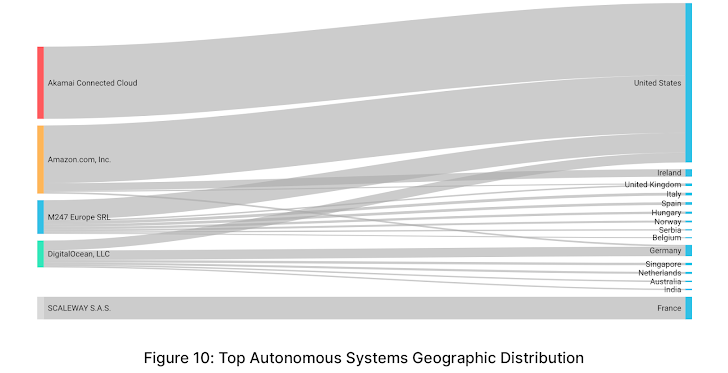 - Autonomous Systems (AS): Cloud Hosting providers are the primary sources of attack traffic. They are useful for conducting large-scale attacks, providing adversaries with cost-efficient computing resources and the ability to distribute their traffic, offering a layer of anonymity.