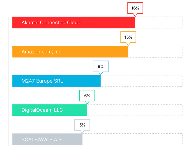 When analyzing corresponding Autonomous Systems (AS) of NLX IP addresses, Akamai Connected Cloud (formerly Linode) accounted for the largest portion of NLX traffic (16%), followed by Amazon (15%), M247 Europe SRL (9%), DigitalOcean (6%) and Scaleway (5%)**.