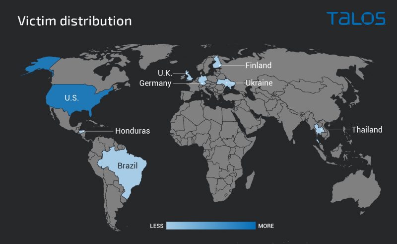 Tortilla, an actor that’s been operating since July, is predominantly targeting U.S. victims. It’s also hurling a smaller number of infections that have hit machines in the Brazil, Finland, Germany, Honduras, Thailand, Ukraine and the U.K., as shown on the map below.