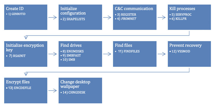 Prior to locking files and changing the desktop wallpaper with a ransom message, some of the major functions carried out by Diavol include registering the victim device with a remote server, terminating running processes, finding local drives and files in the system to encrypt, and preventing recovery by deleting shadow copies.