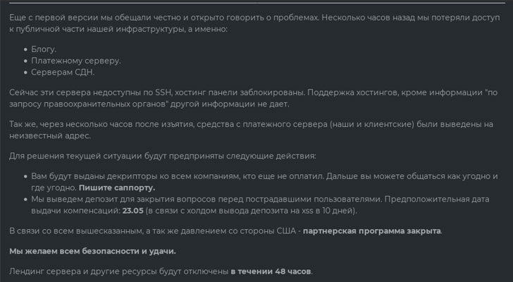 “At the moment, these servers cannot be accessed via SSH, and the hosting panels have been blocked,” the announcement obtained by Intel 471 read.