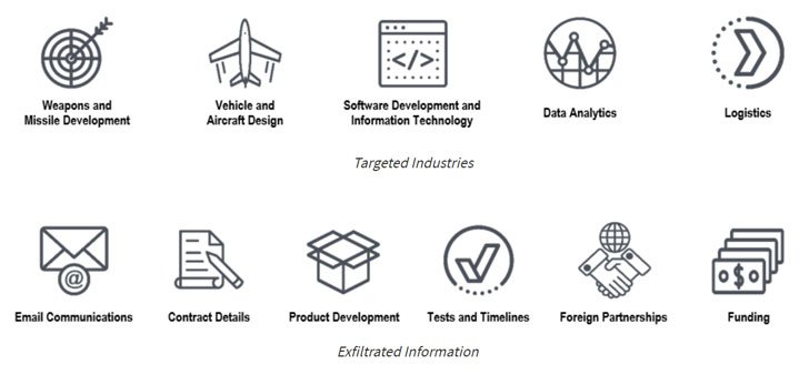 Compromised entities include contractors that dabble in command, control, communications, and combat systems; surveillance and reconnaissance; weapons and missile development; vehicle and aircraft design; and software development, data analytics, and logistics.