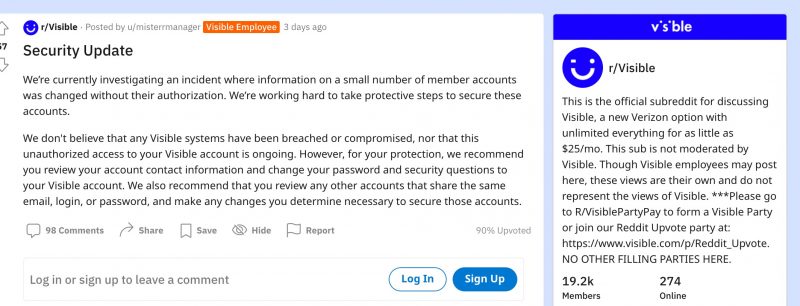 Protecting customer information — including securing customer accounts — is critically important to our company and our customers. As a reminder, our company will never call and ask for your password, secret questions or account PINs. If you feel your account has been compromised, please reach out to us via chat at visible.com. —Visible’s Wednesday statement, posted to Reddit
