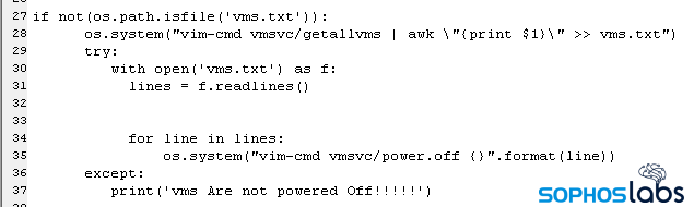 The Python script uses churns out a list of the names of all VMs installed on the ESXi server, then shuts them all down. Source: Sophos.