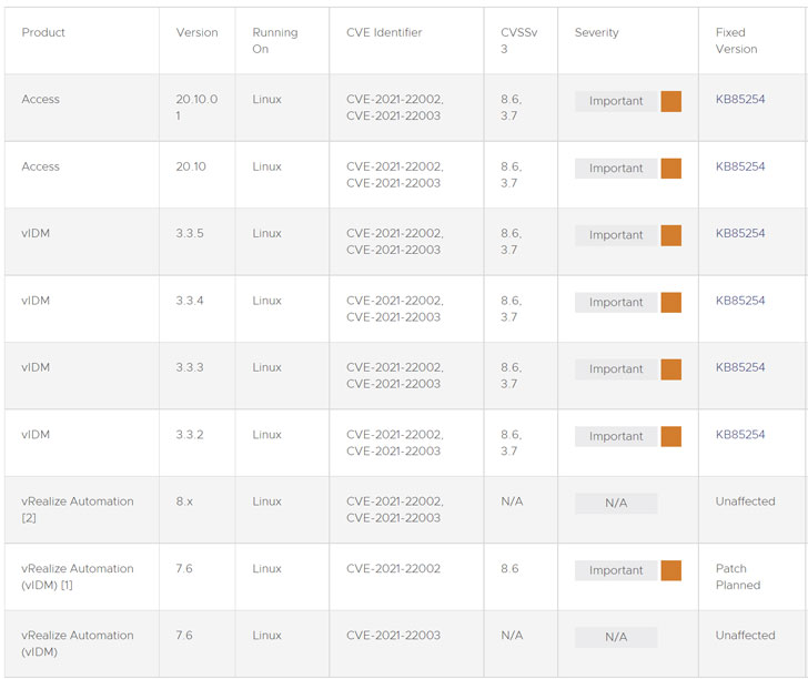 Tracked as CVE-2021-22002 (CVSS score: 8.6) and CVE-2021-22003 (CVSS score: 3.7), the flaws affect VMware Workspace One Access (Access), VMware Identity Manager (vIDM), VMware vRealize Automation (vRA), VMware Cloud Foundation, and vRealize Suite Lifecycle Manager.