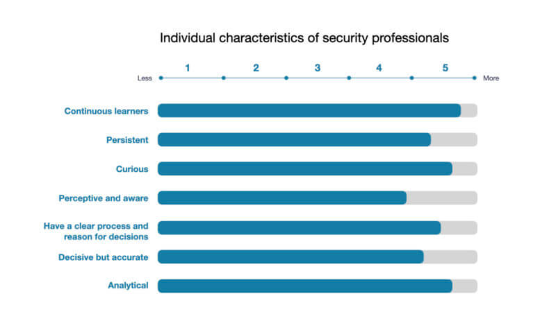 We also explored personality characteristics of security professionals and found that they are highly curious, analytical, and above all else continuously learning. Cyber threats keep evolving, so a large part of the security role is staying on top of new information.