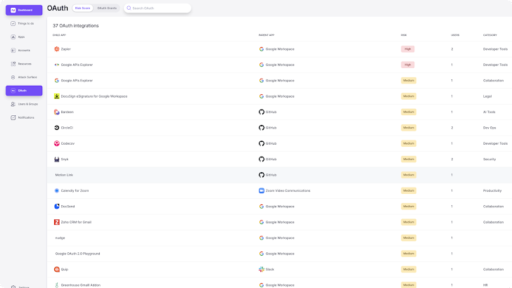 Your modern attack surface extends to every SaaS app, user identity, and OAuth grant used by your workforce to build your products and run your business. That’s why Nudge Security discovers and monitors your entire SaaS attack surface as it changes, including SaaS apps, cloud infrastructure, developer tools, social media accounts, registered domains and more. With Nudge Security, you can see all externally facing assets an attacker could see so you can take proactive steps to protect and minimize your attack surface.
