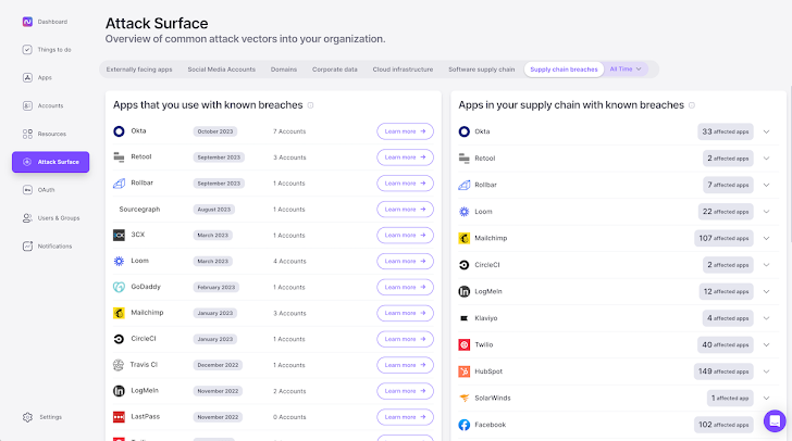 Nudge Security also provides vendor security profiles for each of your SaaS providers, including breach history, compliance attestations, data locality, and more. With this data, you can conduct SaaS vendor security assessments more quickly and prepare for compliance audits more easily. And, only Nudge Security shows you the SaaS supply chain of your SaaS vendors, so when breaches of high profile apps occur you can quickly determine if you are in the blast radius of a third- or fourth-party supply chain attack. You’ll even be alerted if a SaaS provider you use is breached, or if a SaaS tool used by one of your providers is breached.