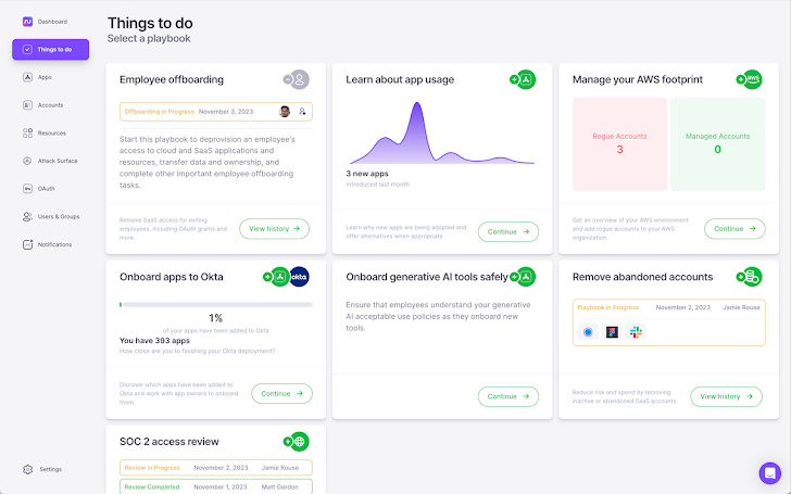 The last thing you need is another security product that creates overhead for your team. Our built-in playbooks automate workflows for common SaaS security tasks, like conducting user access reviews, bringing AWS accounts into central governance organizations, offboarding departing employees, revoking risky OAuth grants, and more so you can minimize time spent on tedious manual tasks.