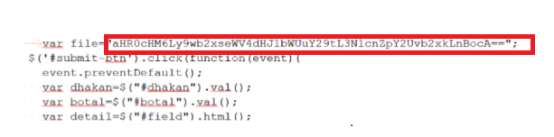 Another example of the embedded script as an attachment in phishing mail contains plain text in the script, but the malicious URL is obfuscated using Base64 encoding.